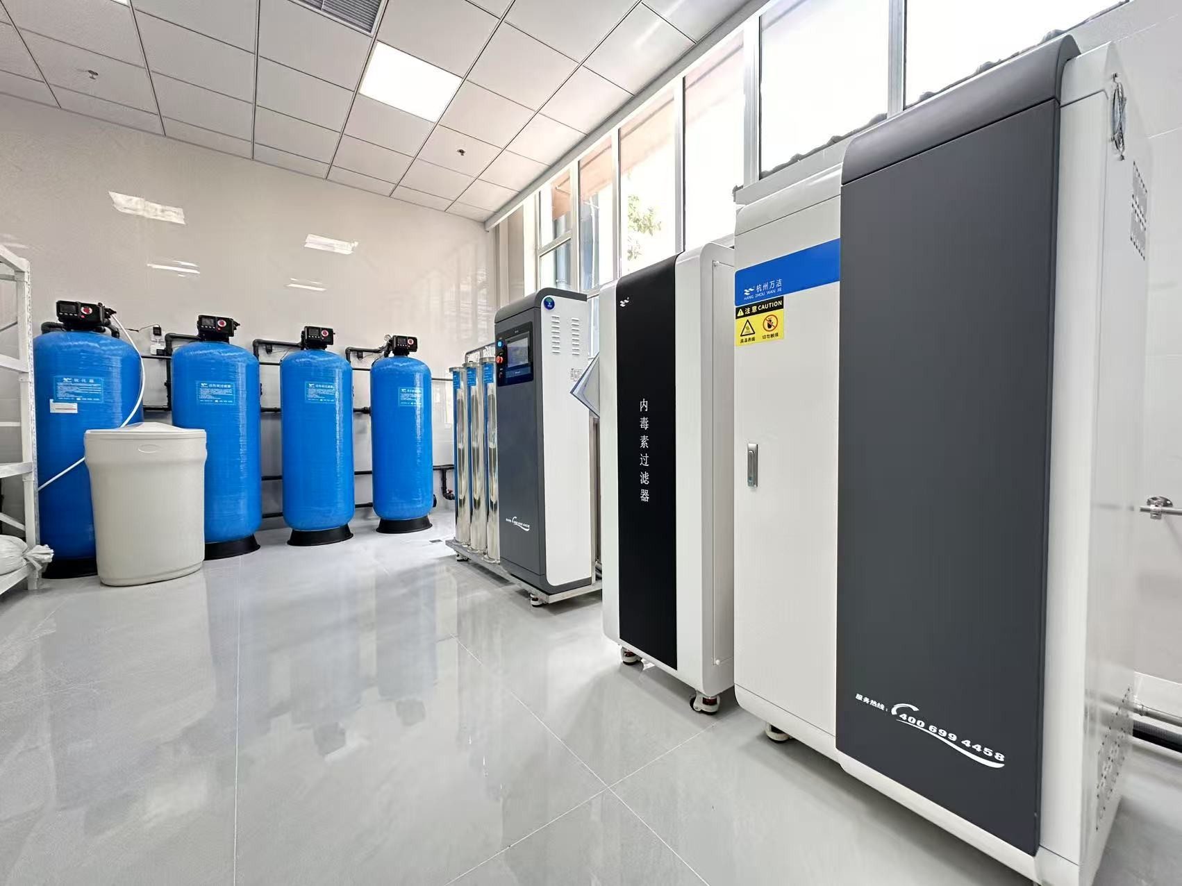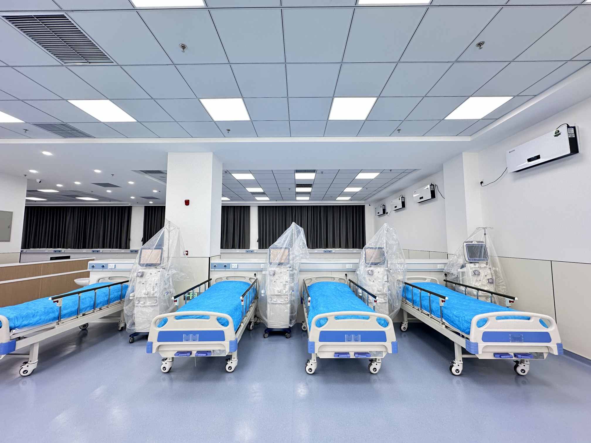 有完善的水处理设备,产水量可供60台透析机使用,并具有热消毒功能,严格保证透析用水安全。空气消毒机共计14台,可以在患者透析前后彻底消毒,保证透析环境干净、整洁。