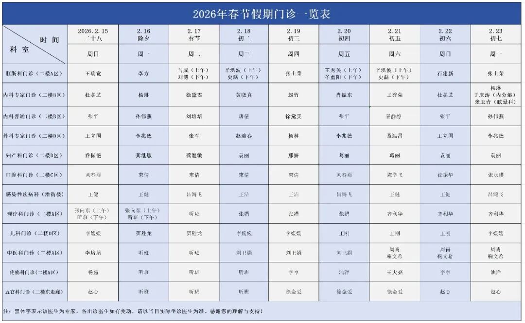 济南市槐荫人民医院2026年春节假期门诊排班如下: