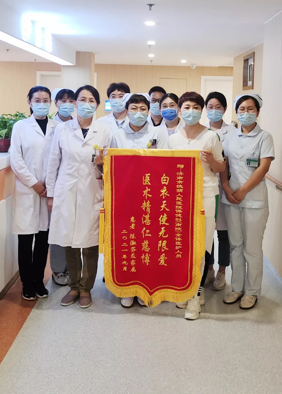 陈奶奶顺利出院后,其家人特意制作了一面锦旗赠予保健科,感谢医护人员科学精准的治疗和无微不至的护理,让老人重获健康。