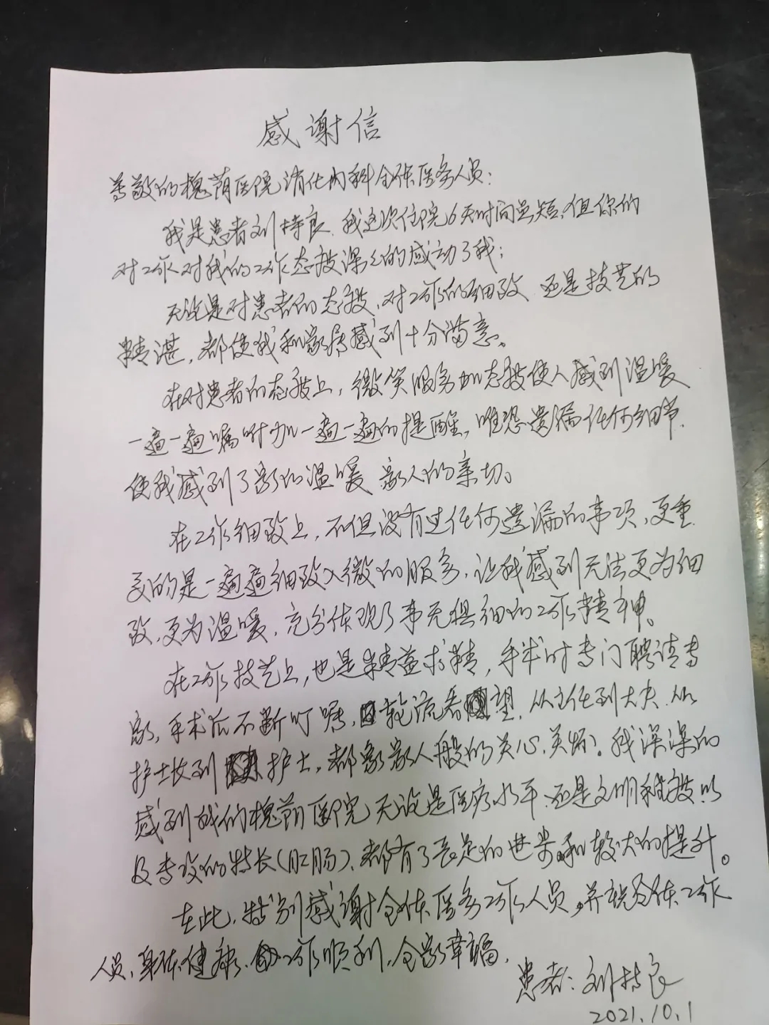 在这个盛世华诞,举国欢庆的日子里,消化内科一早便收到一封来自七旬老人的亲笔感谢信,信纸虽轻,却饱含着老人对消化内科所有医护人员衷心的感谢和祝福之情,让他们收获了这个特殊日子里最温暖的一束阳光。