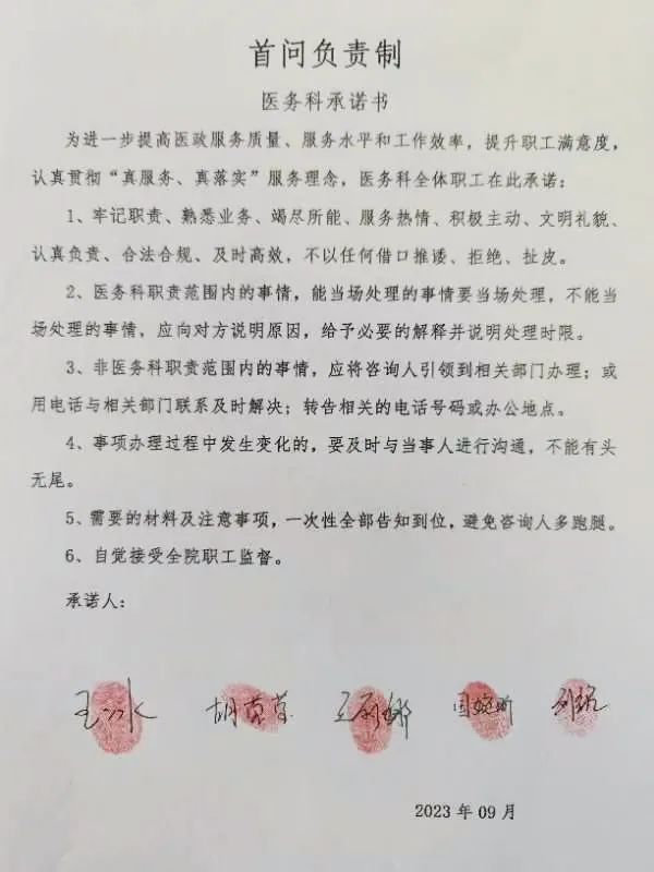 以济南市卫健委“改善患者就医感受提升患者体验”活动为契机,医务科全员签订《首问负责制承诺书》,在今后的工作中将真正把“用情、用心、用力、有效”服务态度和“真情换位、服务到位、不怕麻烦”服务理念落到实处,提高服务水平和工作效率,以实际行动,落实责任担当,确保高效高质服务。