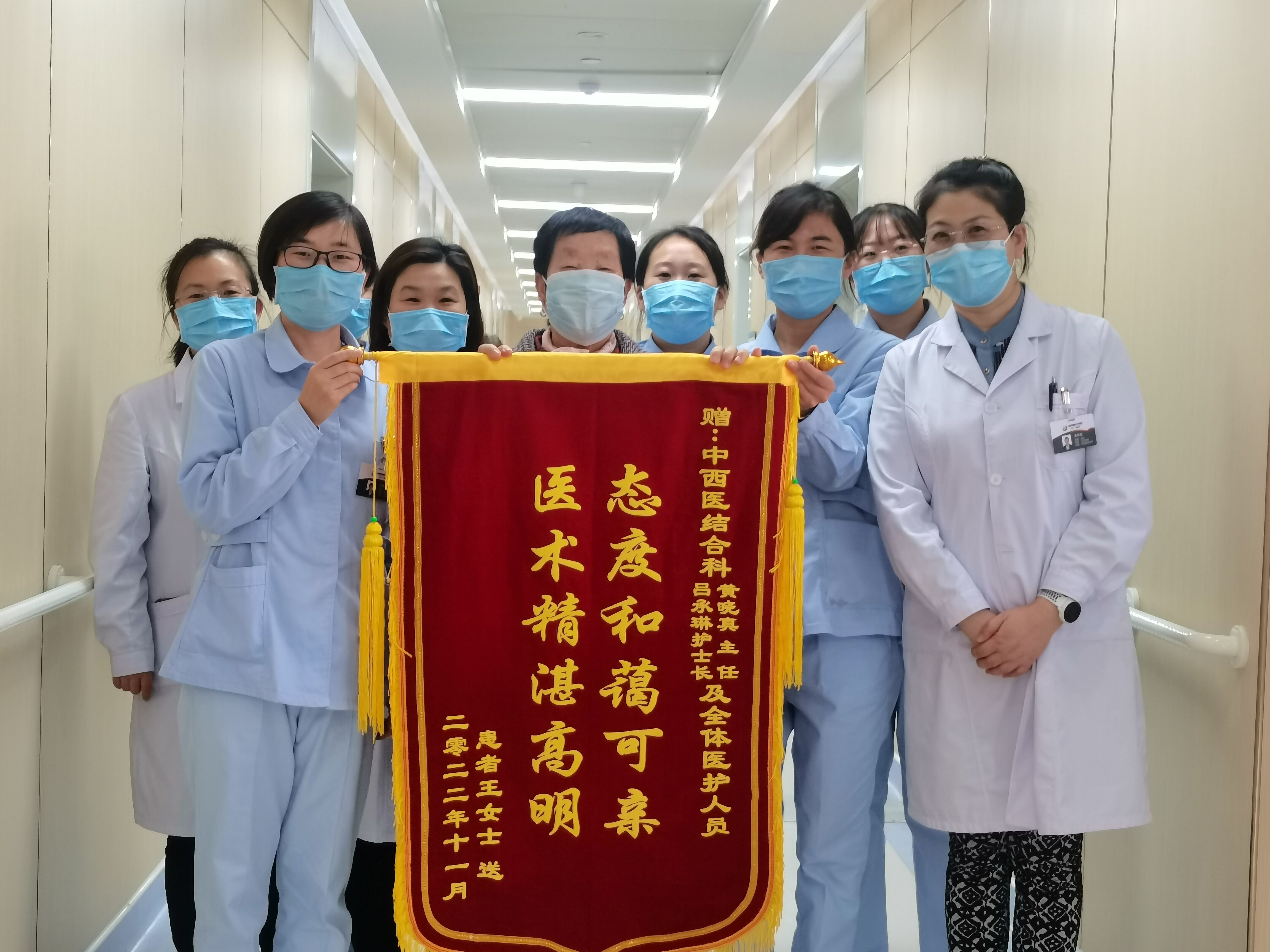 今日,患者王女士满怀感激之心给槐荫人民医院纬十一路院区中西医结合科送来了一面锦旗,感谢住院期间全体医护人员的贴心服务及专业技术,锦旗中写到:“态度和蔼可亲,医术精湛高明”。这句简短的表扬,充分体现出患者及家属我们工作的认可。