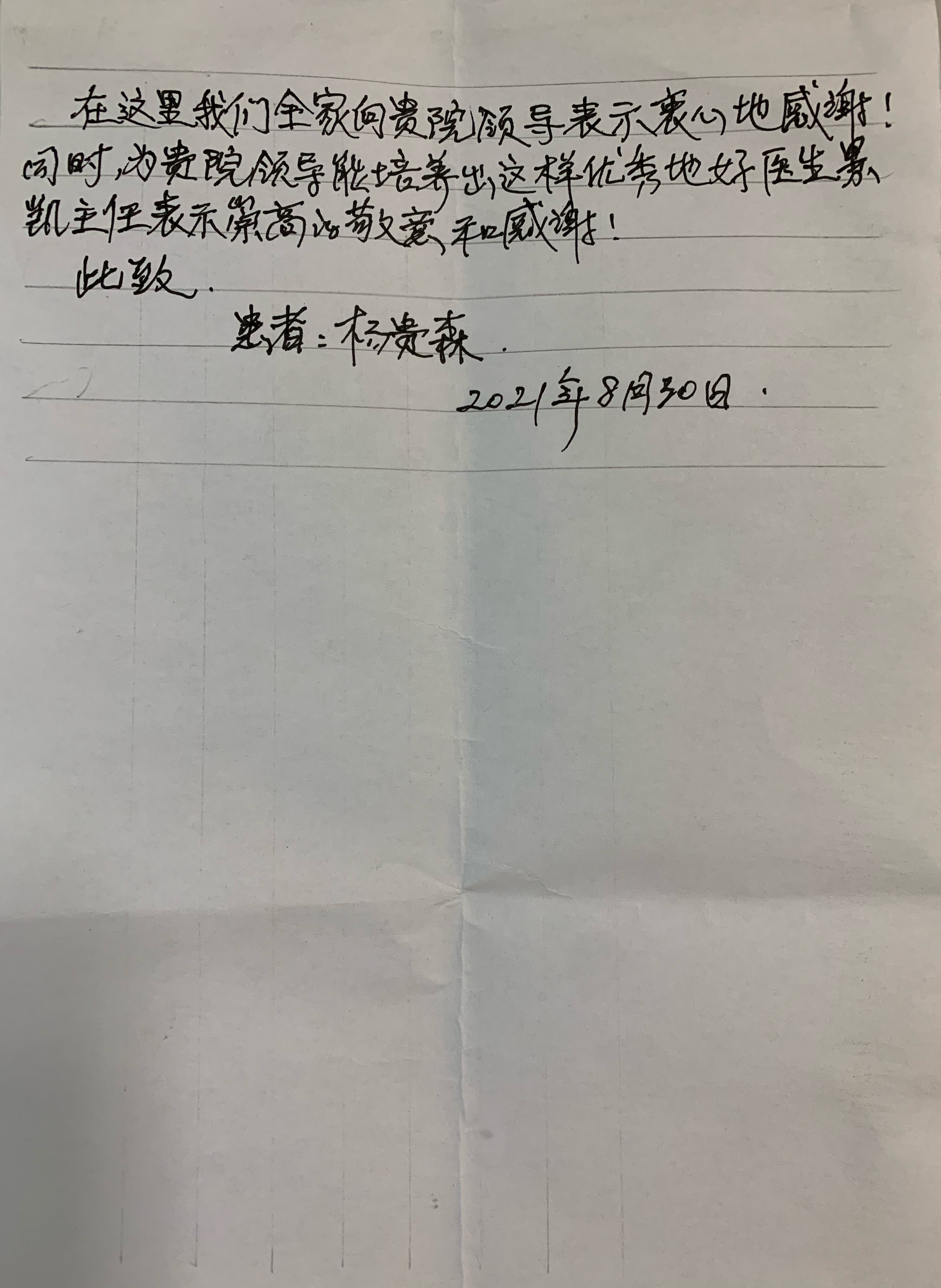 没有豪言壮语、只有兢兢业业;没有声名赫赫、只有默默奉献。感谢信中提及的景凯主任就是这样,在平凡的岗位创造着不平凡的坚守与奉献。景凯主任从医以来,医治的患者不计其数,但他始终不忘初心,永远把为病人服务放在首位。他从不因工作任务繁重而抱怨,用朴实、善良、敬业丈量职业生涯的每一步,绽放出自己普通人生的别样光彩。面对患者,他总是一副笑脸相迎,耐心的询问患者,以最大的同情缓病人之心苦,用最专业的医术解患者之身痛。医者仁心,在景凯主任身上得到充分的体现。