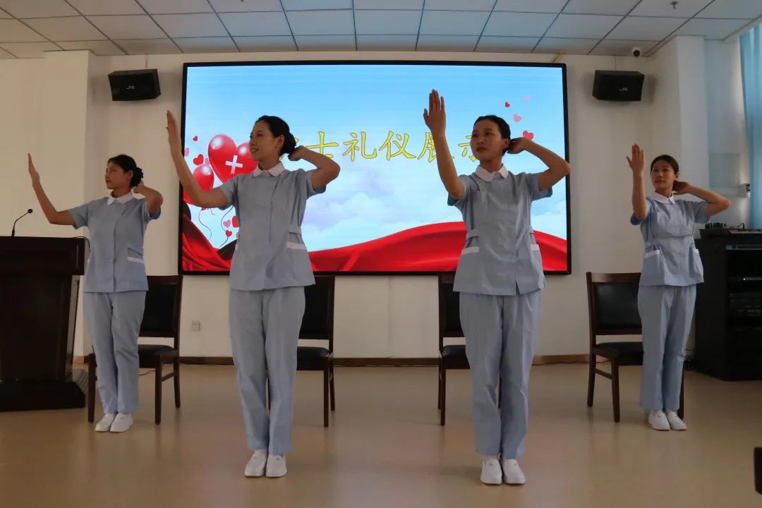 伴随着悠扬的音乐,护士礼仪团队以形体展现方式,演示脱帽后的护理礼仪规范。
